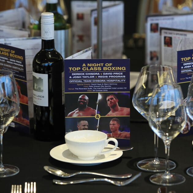 We were delighted to work with Dereck ‘Del Boy’ Chisora’s team to offer official Team Chisora fight night top class boxing hospitality in the 5* Intercontinental O2 Hotel with cracking tickets to what turned out to be one of the most memorable fight nights of the year. Following the late withdrawal of New Zealand’s Joseph Parker, fellow Briton Dave Price stepped up for the challenge against Chisora at very late notice, a brave move indeed. Sharing top billing was a world title bout between two unbeaten superstars – Scottish tyro Josh Taylor defending his IBF light welterweight title against American Regis Prograis, with the latter’s WBA (Super) title also on the line, as well as the World Boxing Super Series crown.
