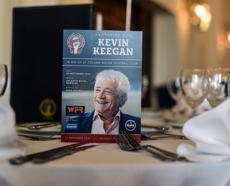 Guests enjoyed a truly special night of football, fine dining, and fundraising at An Evening with Kevin Keegan, held at the elegant Atlantic Hotel in Newquay. The event brought together fans, friends, and supporters of St Columb Major AFC for an unforgettable evening celebrating one of English football’s most charismatic figures, all while raising vital funds for the future of the local club.