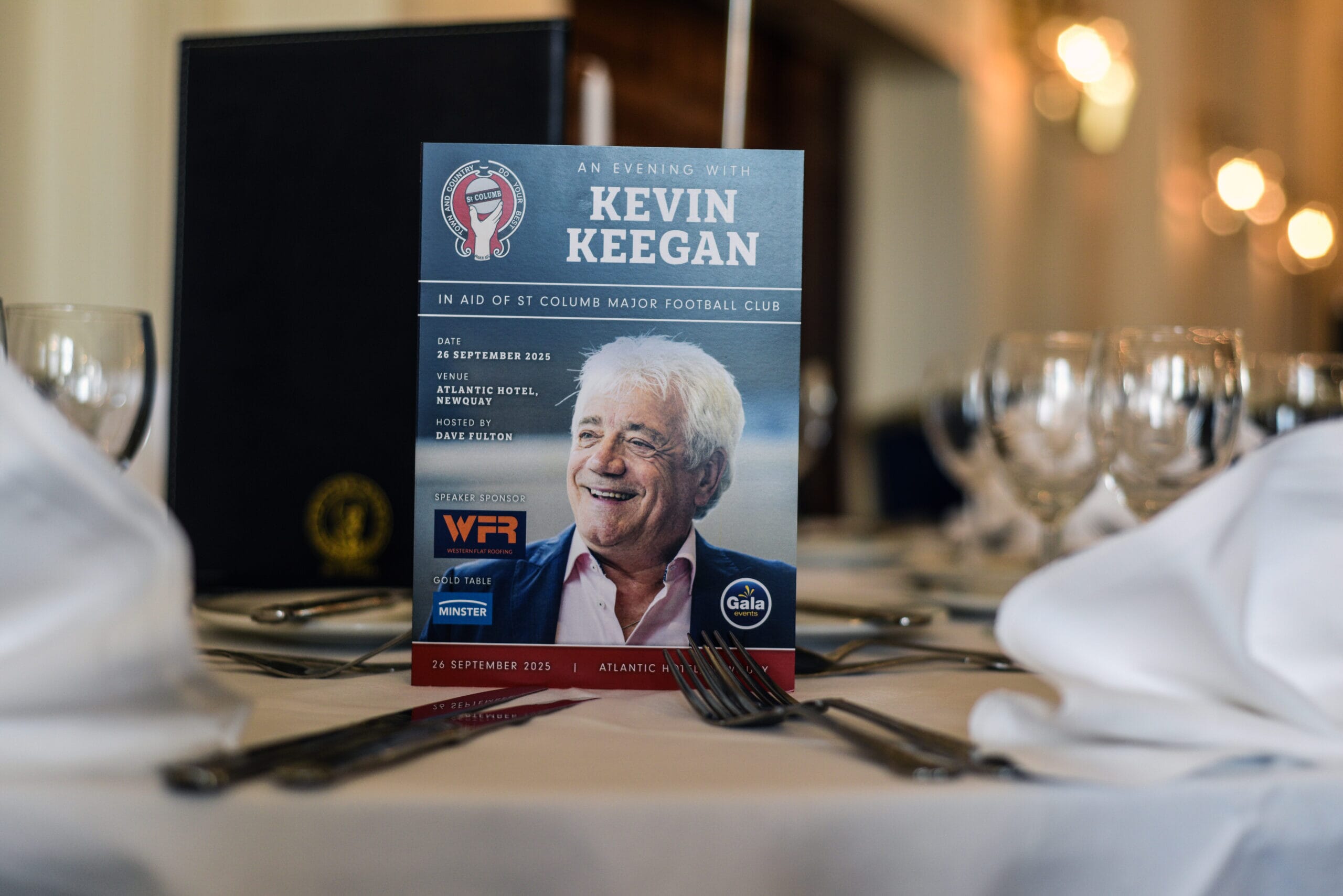 Guests enjoyed a truly special night of football, fine dining, and fundraising at An Evening with Kevin Keegan, held at the elegant Atlantic Hotel in Newquay. The event brought together fans, friends, and supporters of St Columb Major AFC for an unforgettable evening celebrating one of English football’s most charismatic figures, all while raising vital funds for the future of the local club.