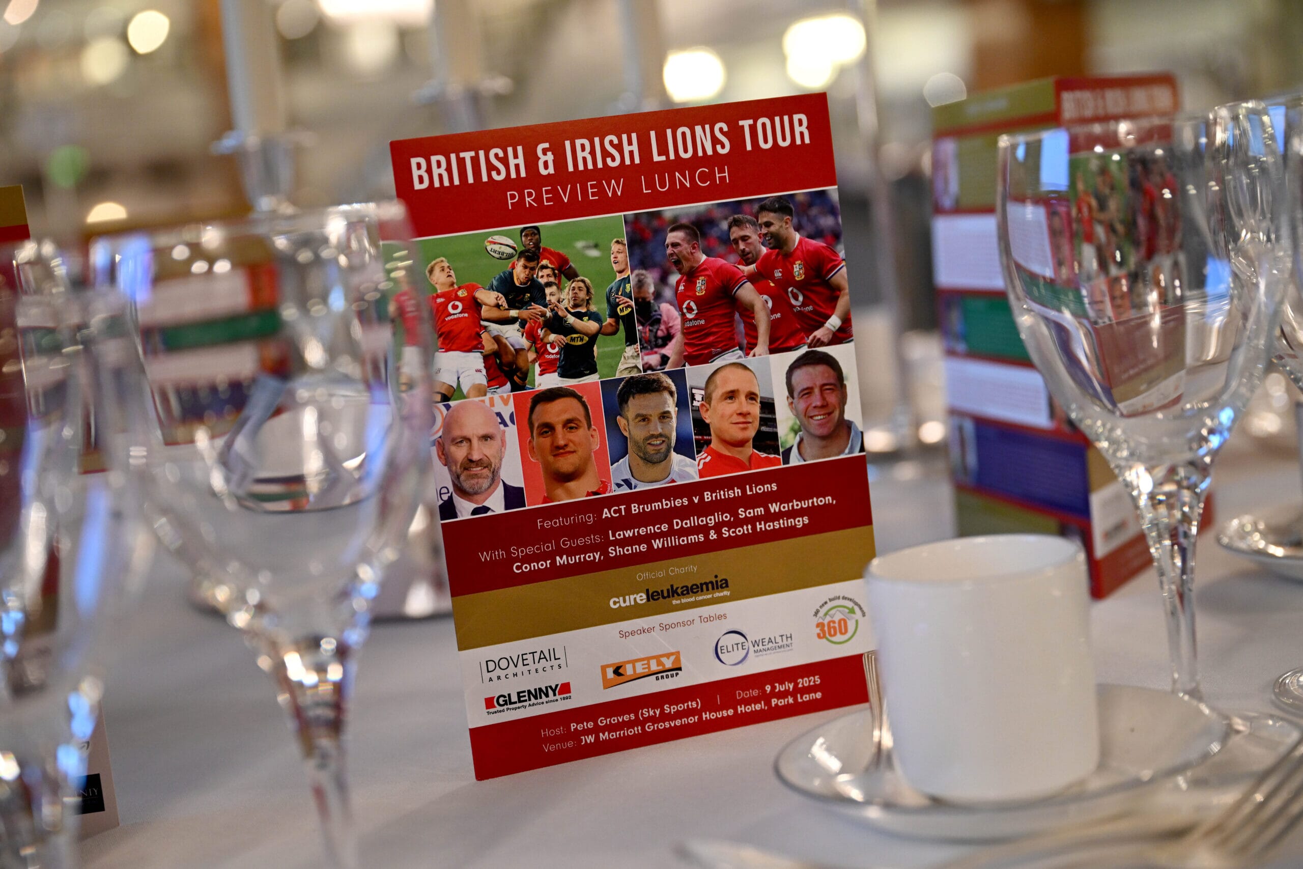 Guests gathered at the prestigious JW Marriott Grosvenor House on 9 July 2025 for our British & Irish Lions Tour Preview Lunch, a spectacular day of rugby hospitality and insight ahead of the Lions’ summer tour of Australia. Taking place in the Great Room and hosted by Sky Sports’ Pete Graves, the event featured a live big-screen broadcast of the Lions’ final warm-up match against the ACT Brumbies.