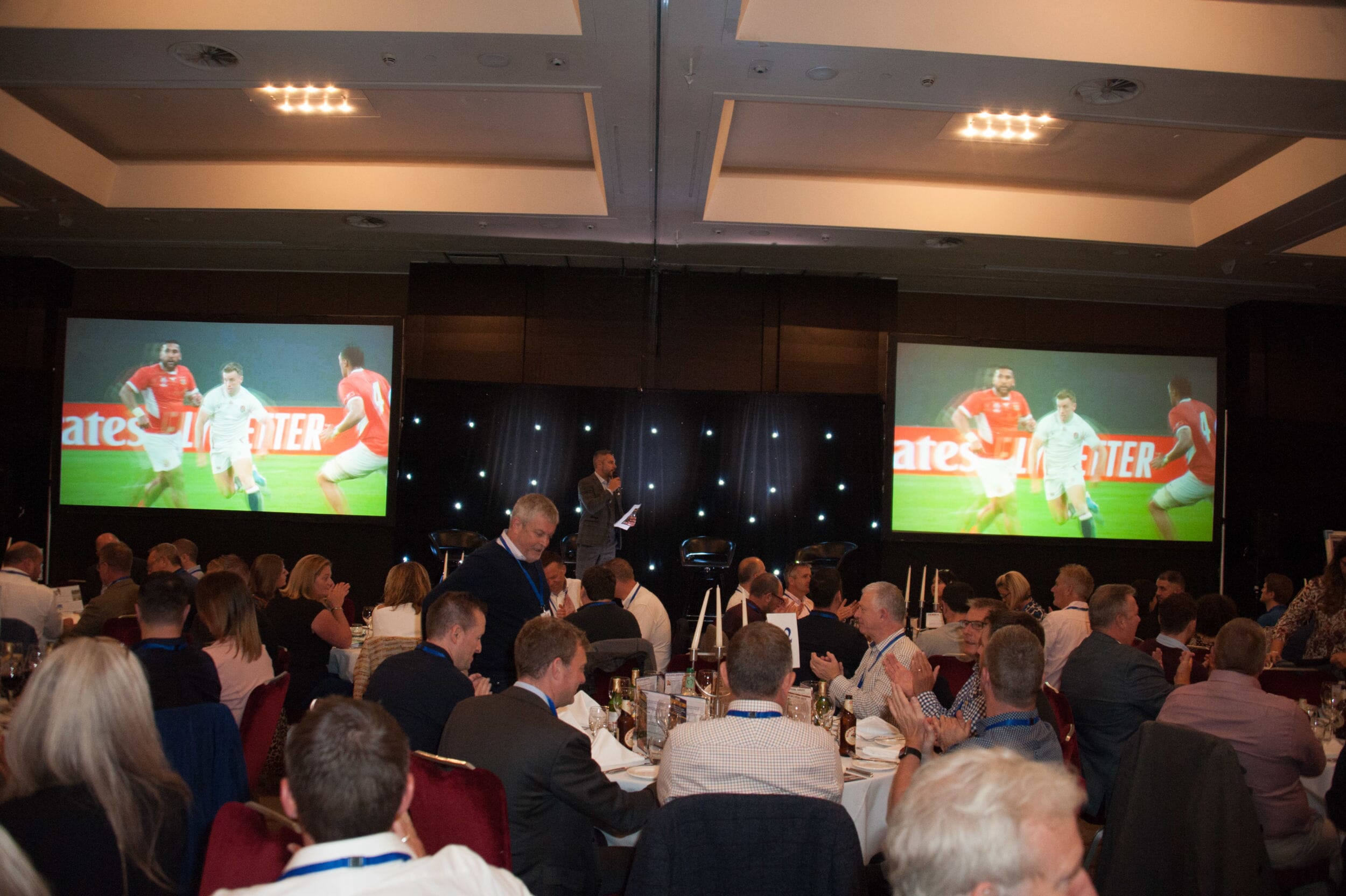 Sold out weeks in advance, 370 guests joined us in the Ball Room at the Park Plaza Riverbank in London for our Ultimate Rugby World Cup big screen event featuring the group match between England and the USA beamed live from Japan.
