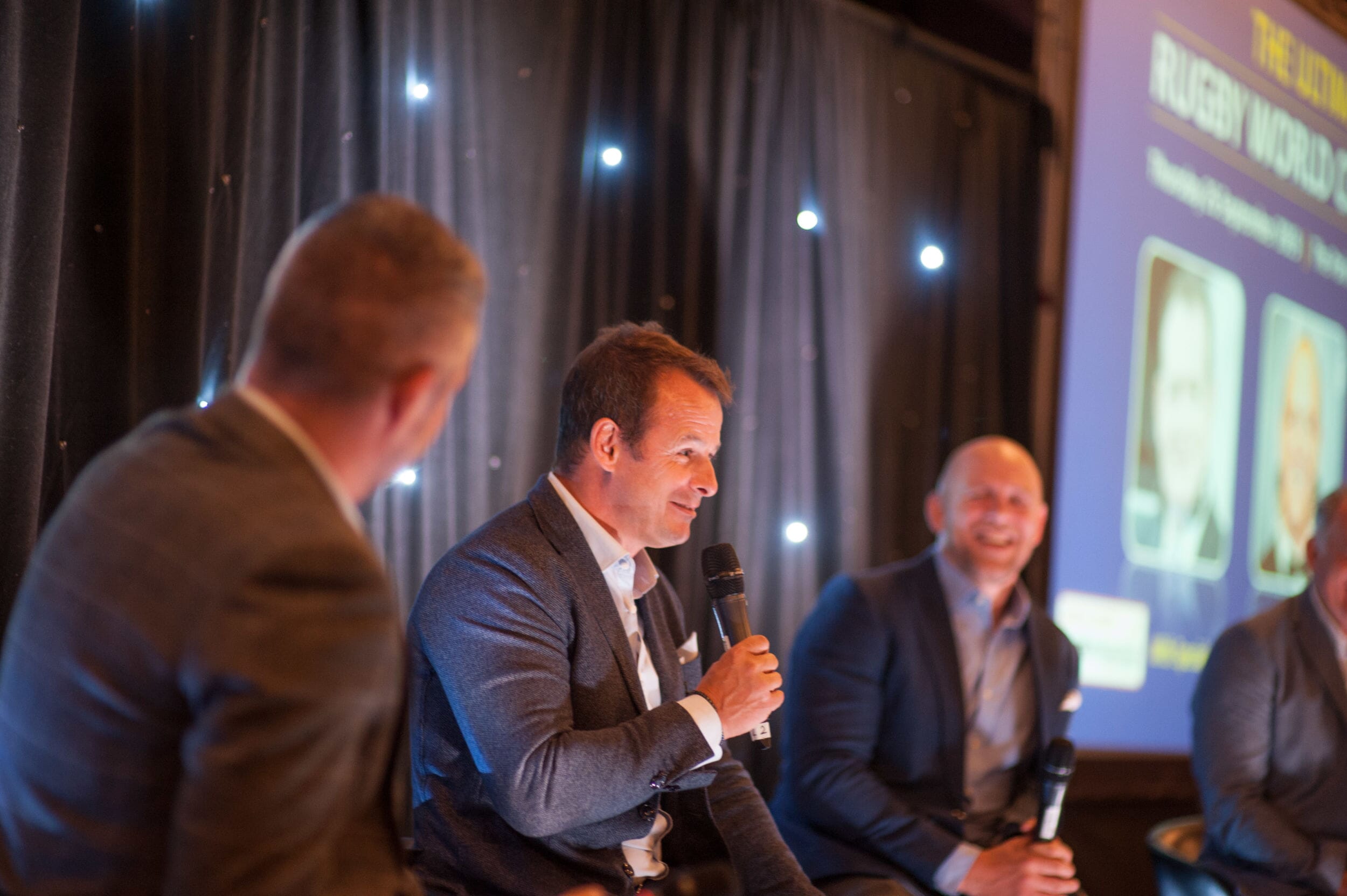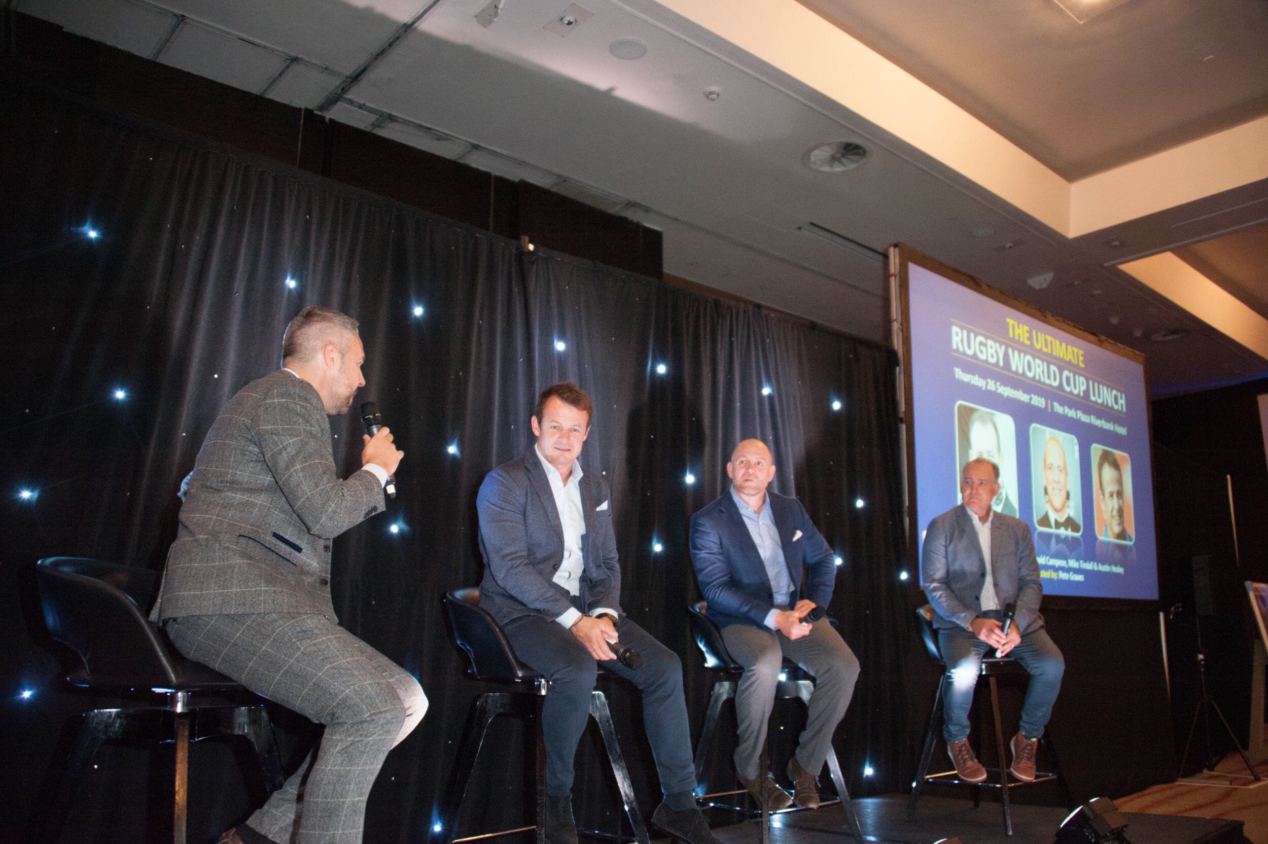 The room at the Park Plaza is perfect for these Ultimate Rugby World Cup event screenings and everyone had an amazing view of our top-of-the-range giant screens. Following the match, and with the comp bar taking quite a battering, a three course lunch was served followed by a lengthy on stage interview with our three stars about their careers and the prospects of their respective nations in the Rugby World Cup.